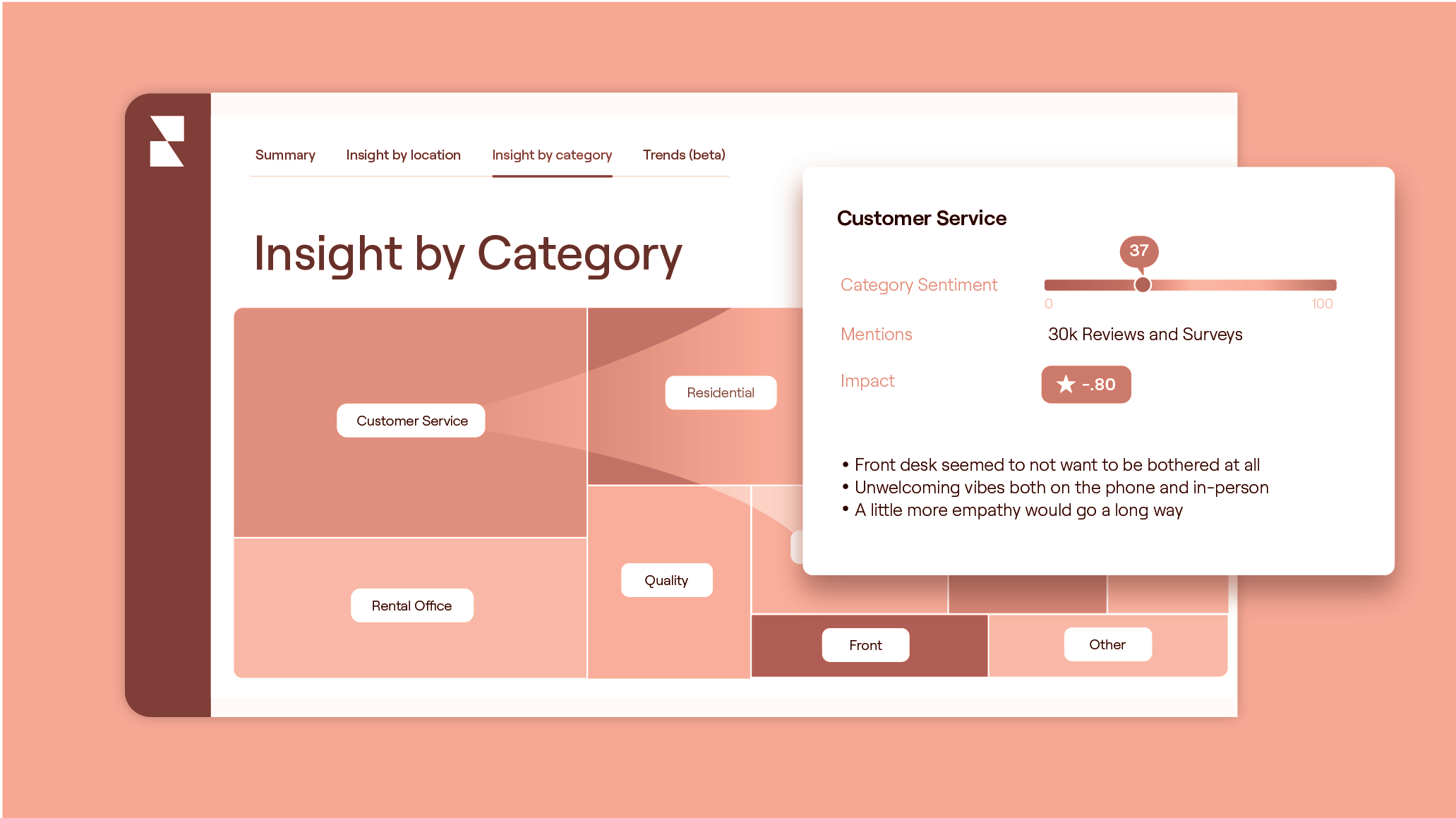 With category analysis, you can easily pinpoint exactly what factors are most positively and negatively affecting your online ratings compared to your competition. Leveraging competitive insight tools deliver this information in real-time so your business has the ability to get ahead of potential brand crises, your competition, and the latest trends in consumer behavior.